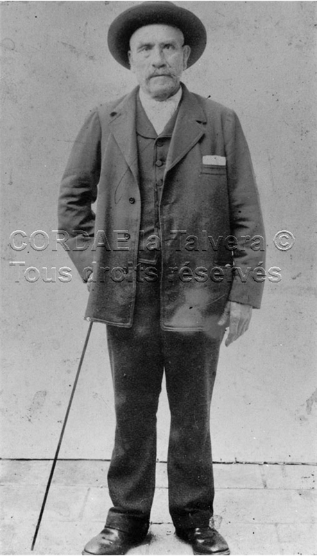 Portrait de Germain Portes (famille de Noël Richard de Vaour) qui habitait Vindrac. Il porte un chapeau et tient une canne.